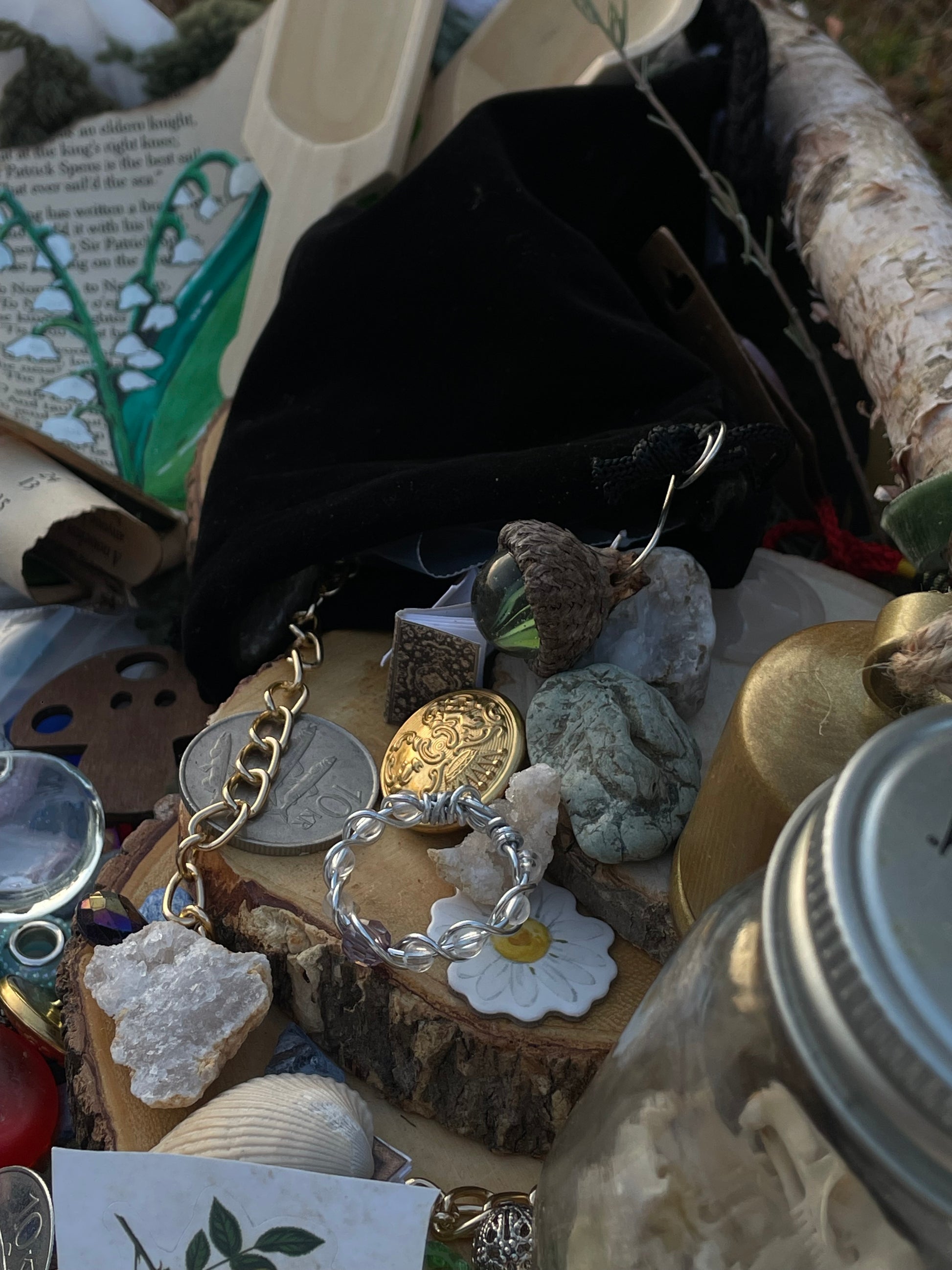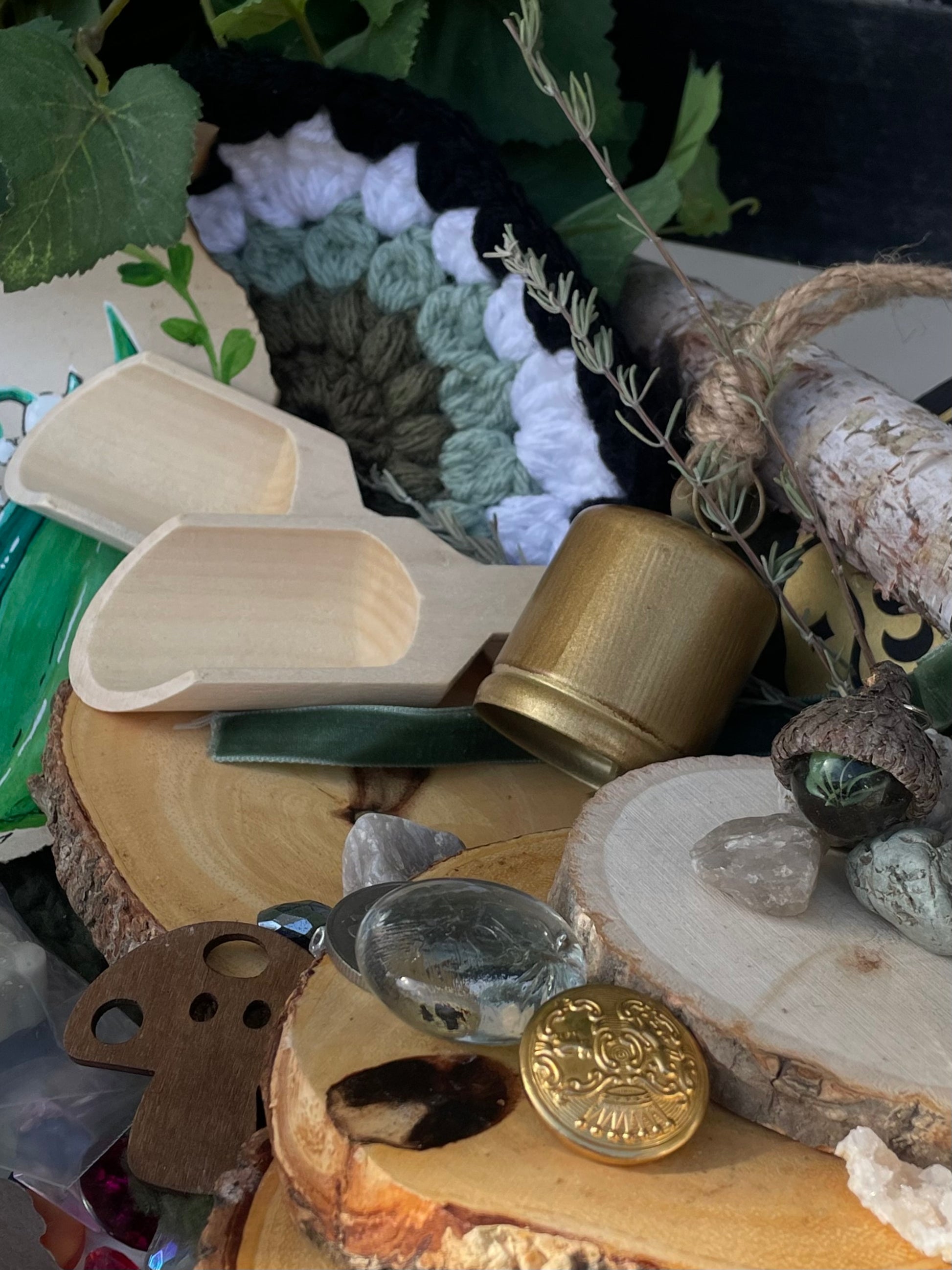 Perhaps a luminous button that once adorned a travelers coat, or glass beads that shimmer with captured starlight. You might uncover a delicate piece of forgotten jewelry, a page torn from a grimoire long thought lost, or small bones- sacred offerings from the natural world. Inside could rest coins from distant lands you've only dreamed of visiting, or a miniature tome from the crow's own enchanted library.